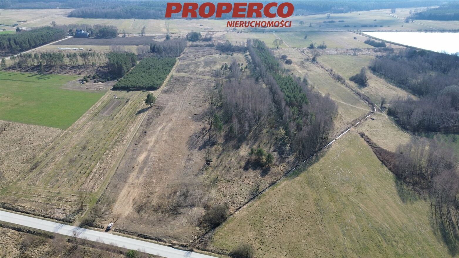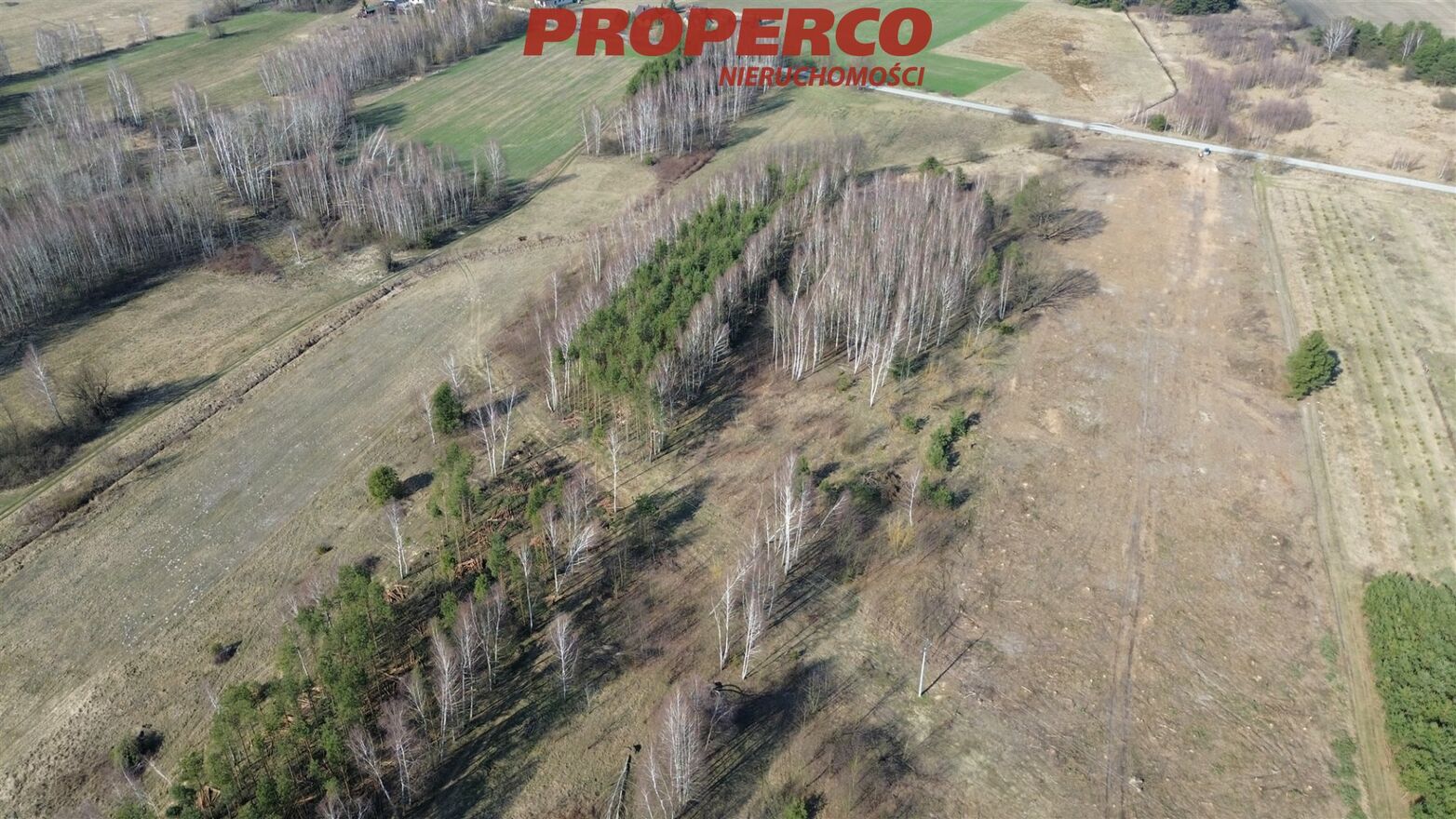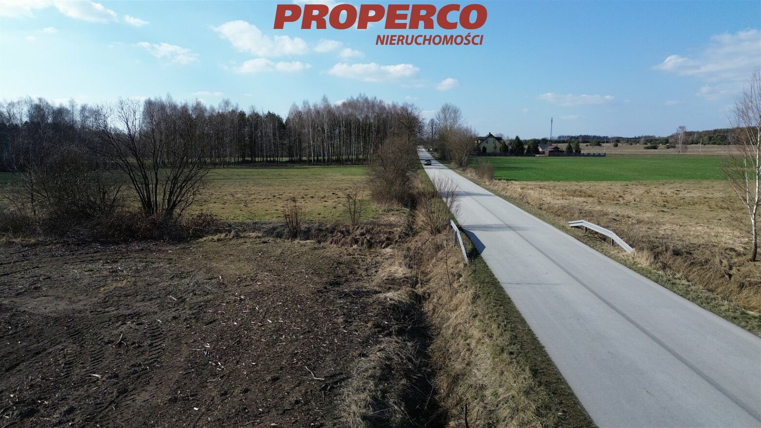 The property is divided by a municipal road, and the Biała Nida River flows through its end.