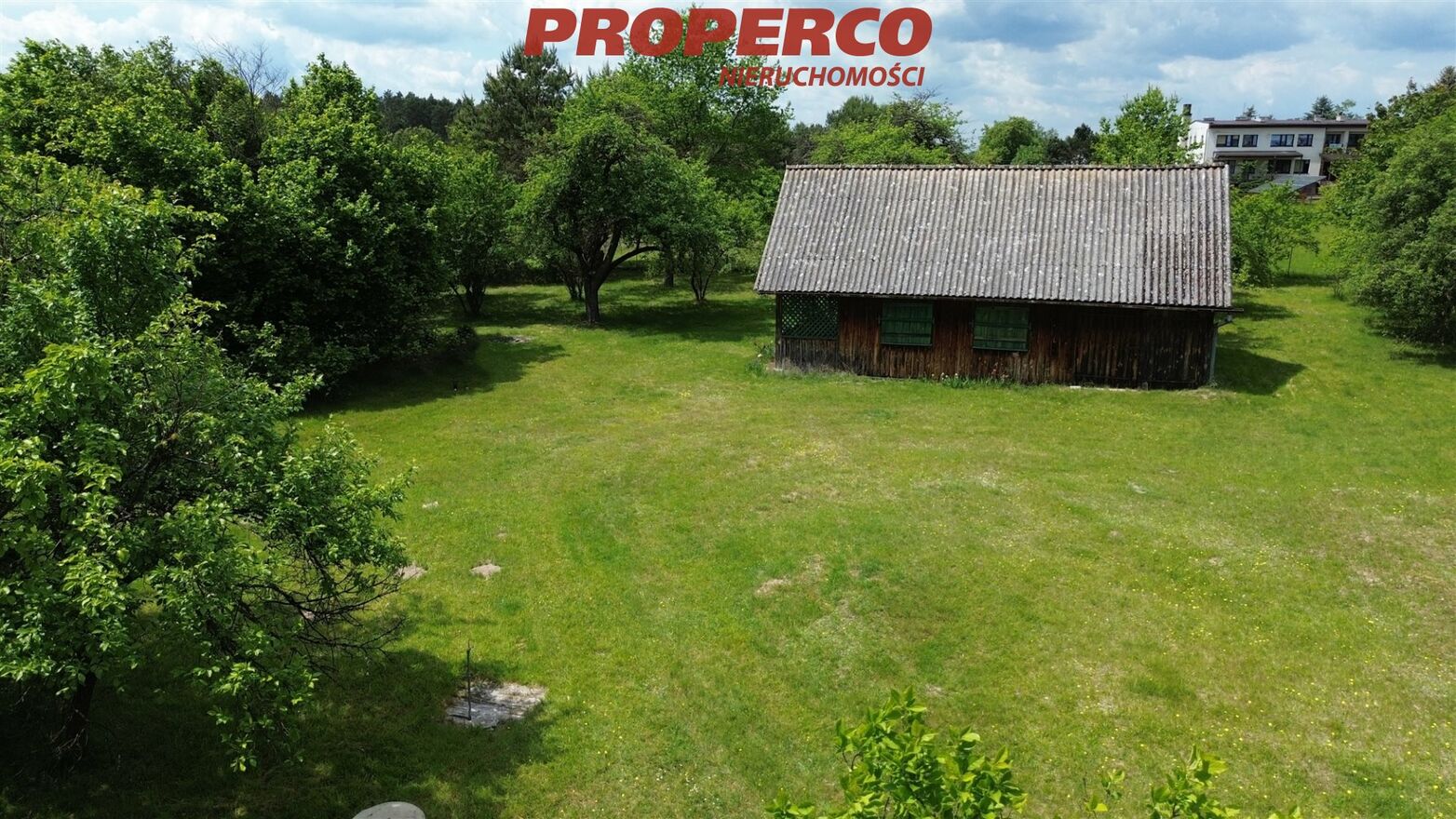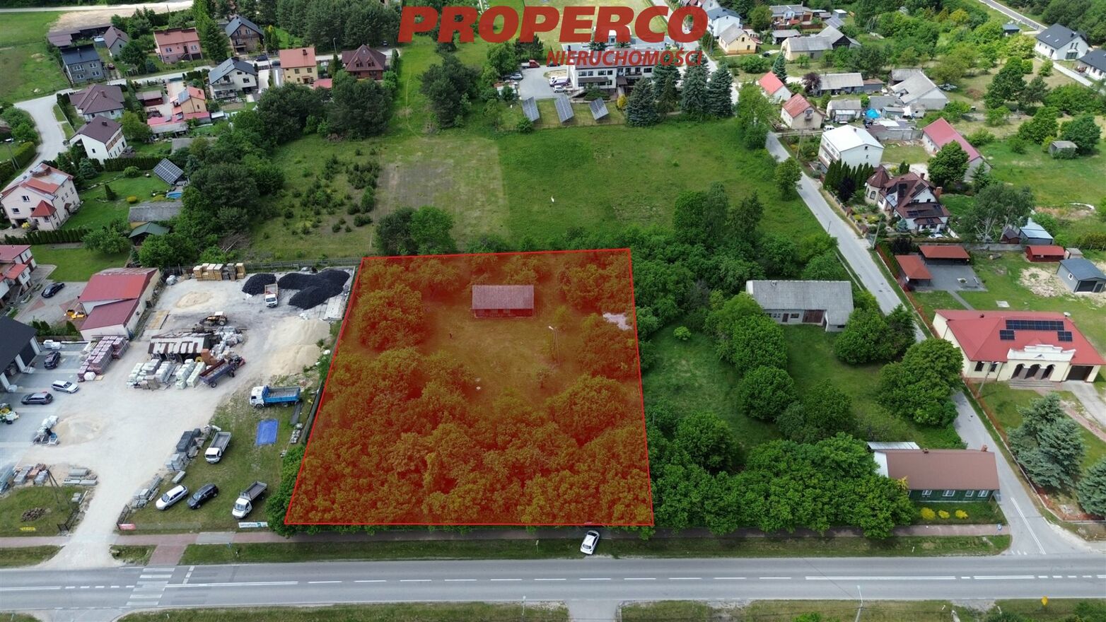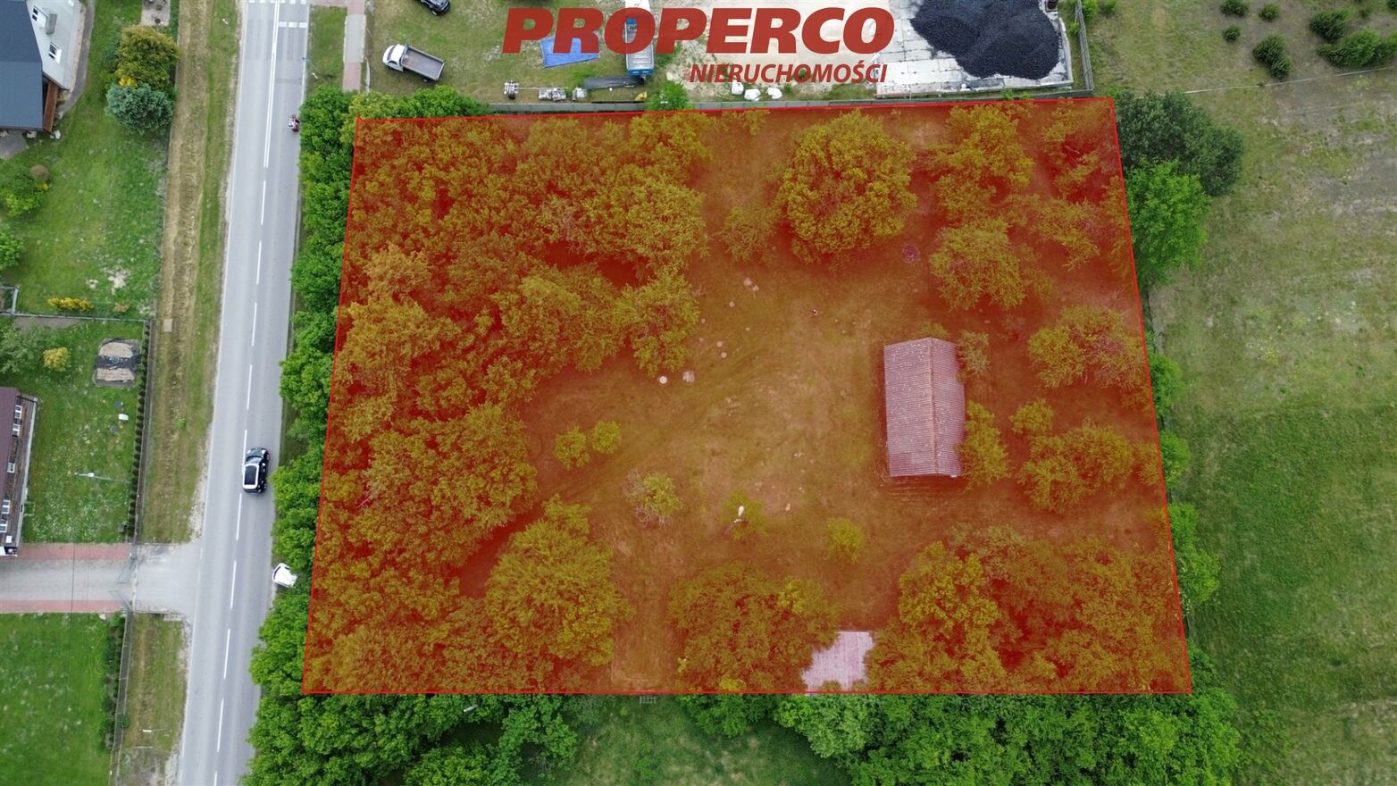 The property is situated in the first line from the provincial road - Jędrzejowska Street. Nearby plots are developed. The land is flat, rectangular in shape, and fenced. There is an outbuilding on the plot currently used as a summer house. The front part of the property is covered with trees and shrubs.